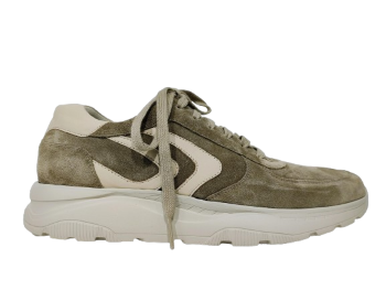 Floris Van Bommel – 1143 – Dit is een nette loafer op een sportieve kuipzool. Het loopvlak van de zool is voorzien van een karakteristiek zigzagpatroon dat ook aan de zijkant zichtbaar is. Uitneembaar voetbed. Kleur : licht taupe